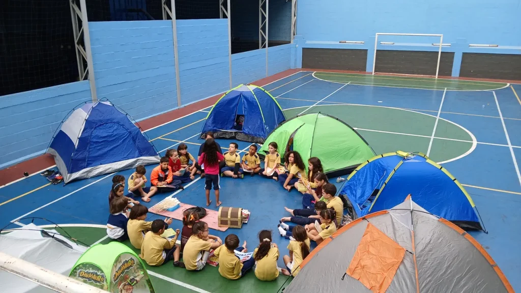 As crianças trouxeram de casa barracas de acampamento, almofadas, lanternas, livros literários e um delicioso lanche coletivo. A turma foi dividida em pequenos grupos que se acomodaram nas barracas. Os livros literários foram disponibilizados e cada estudante escolheu qual gostaria de ler. Após a leitura dos livros escolhidos, o grupo discutiu entre si sobre o que leu e, em um segundo momento, elegeu um livro para trabalhar o reconto da história para os demais colegas.
