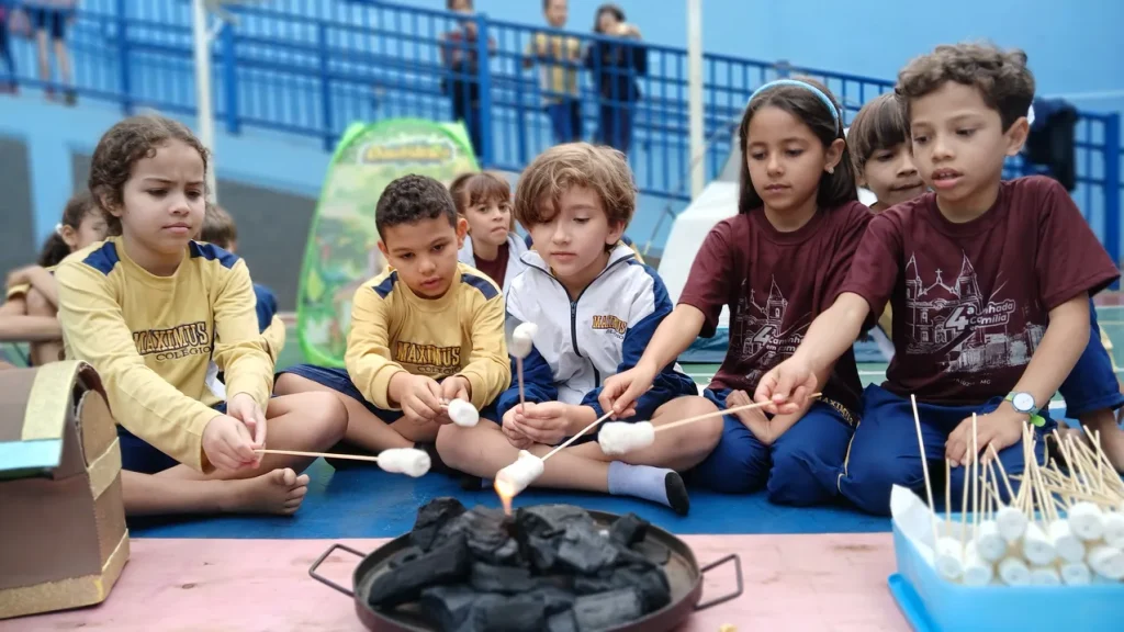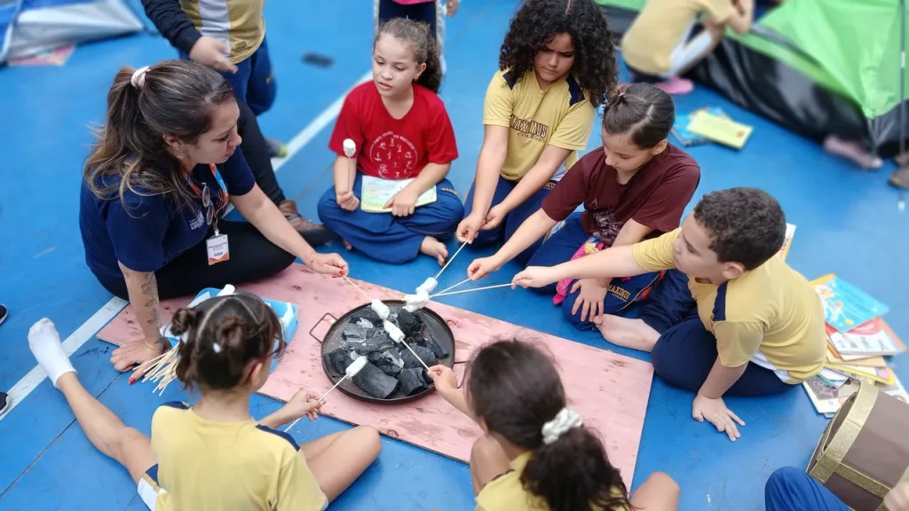 Depois da atividade, os estudantes participaram do lanche coletivo, no qual não poderia faltar o marshmallow assado na fogueira, típico dos acampamentos tradicionais. Ao retornarem para a sala de aula, fizeram o registro da experiência e uma ilustração, expressando seus aprendizados do dia.