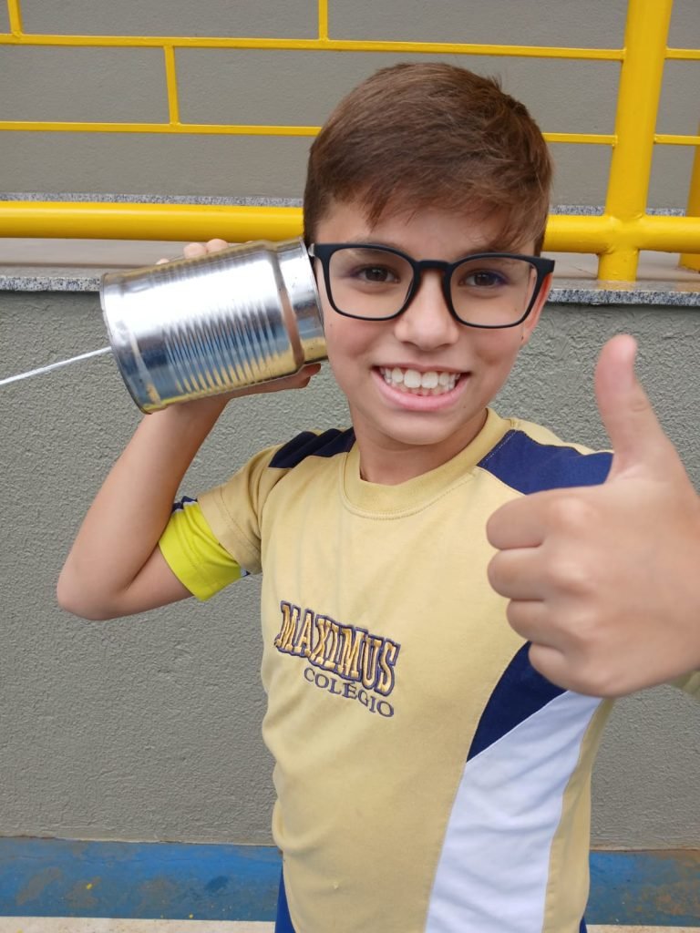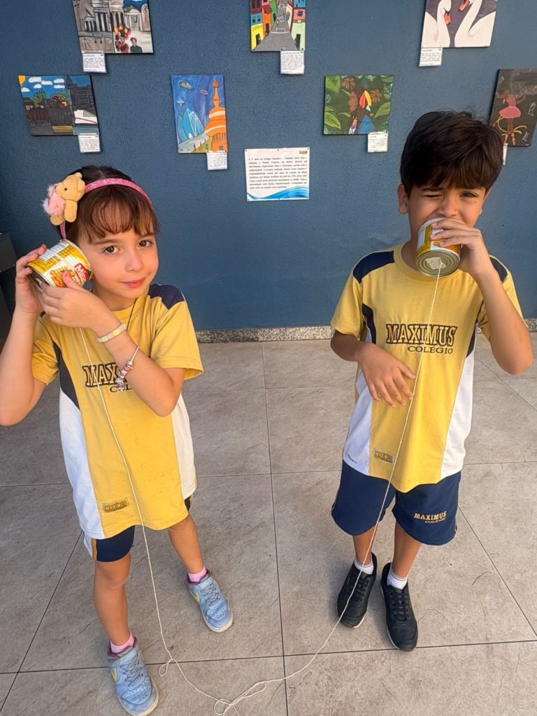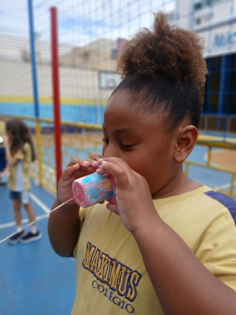 Pensando em estudar esse conteúdo de maneira prática e lúdica, o Colégio Maximus — Unidade Santa Inês trabalhou com os estudantes do 3º ano do Ensino Fundamental — Anos Iniciais uma atividade simples e muito divertida para investigar uma pergunta curiosa: um cordão pode transportar o som? Por meio do experimento conhecido como telefone sem fio, utilizamos dois copos conectados por um cordão para demonstrar como o som pode se propagar.
