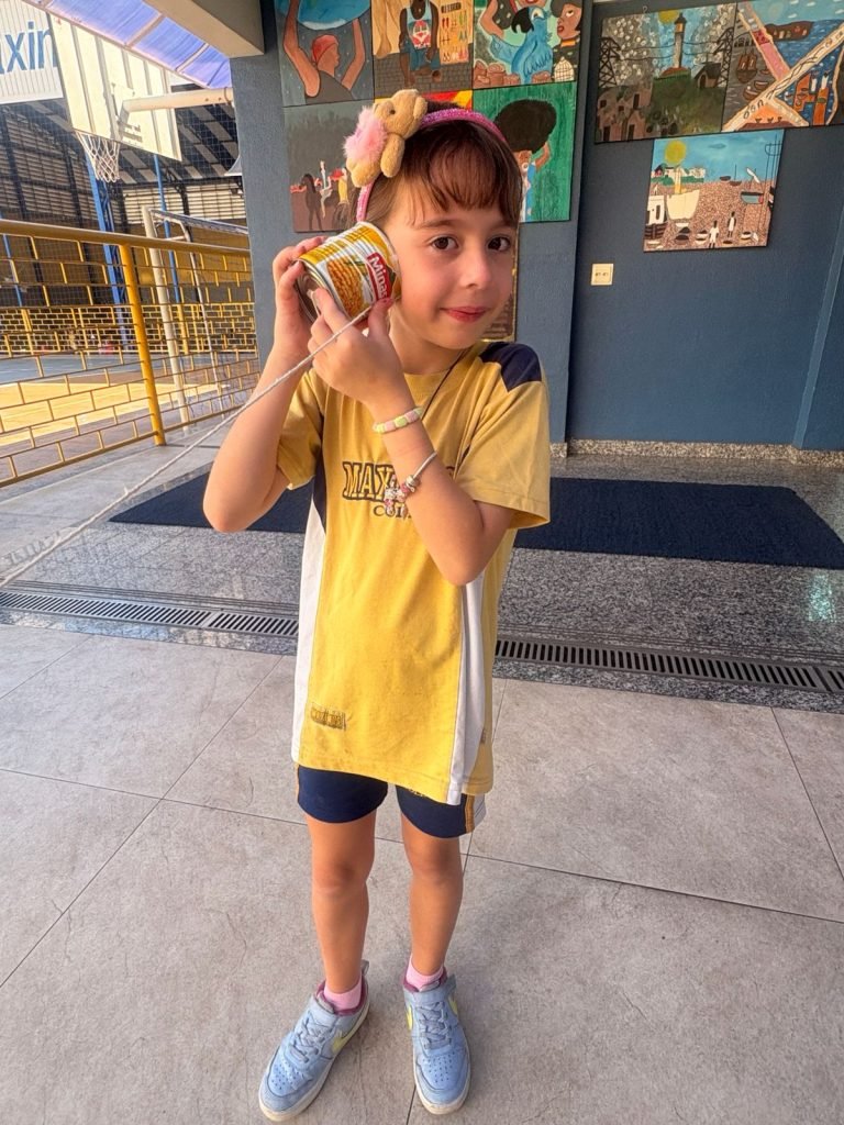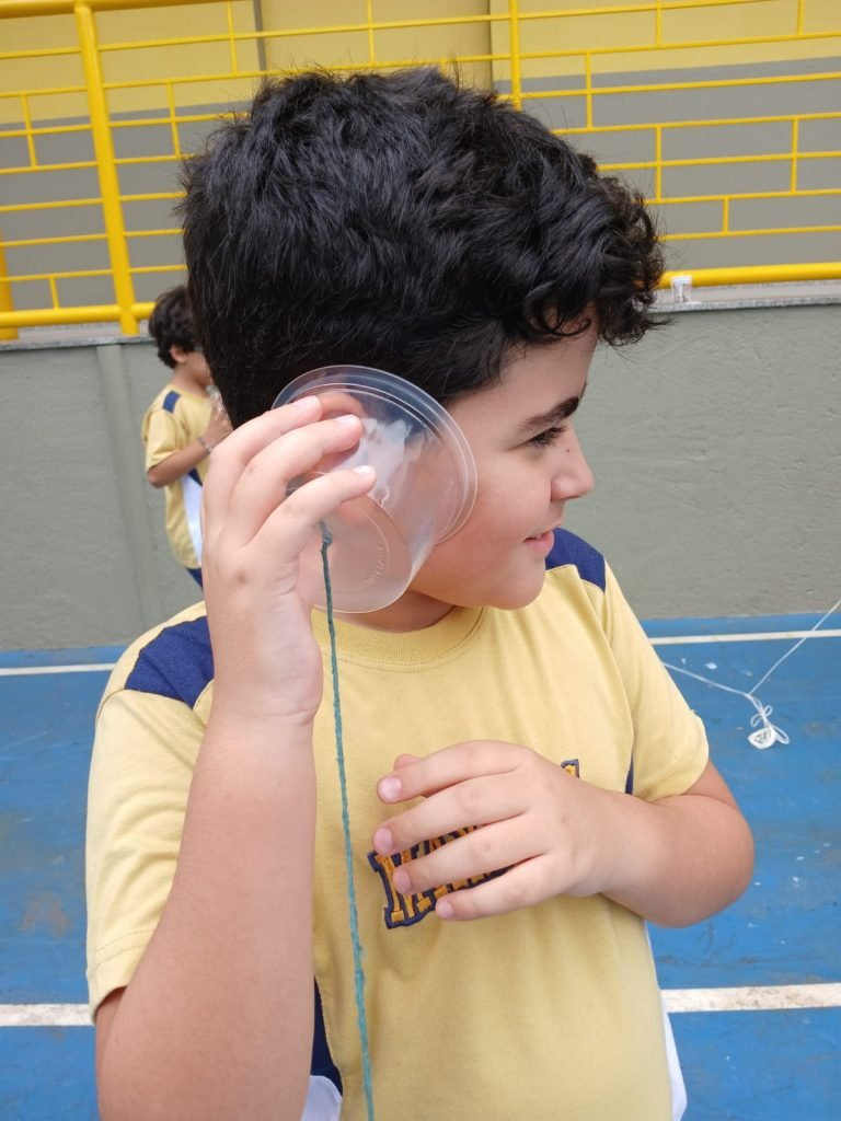 Durante a experiência, os alunos puderam observar que, ao falar em um dos copos, as vibrações da voz percorrem o cordão até chegar ao outro copo, permitindo que o colega escute a mensagem. A atividade despertou a curiosidade das crianças e incentivou a observação, a investigação e o levantamento de hipóteses sobre como o som se desloca. Além de tornar o conteúdo mais concreto e compreensível, a prática também estimulou a participação ativa dos estudantes, mostrando que a ciência pode ser explorada de maneira significativa no dia a dia da sala de aula