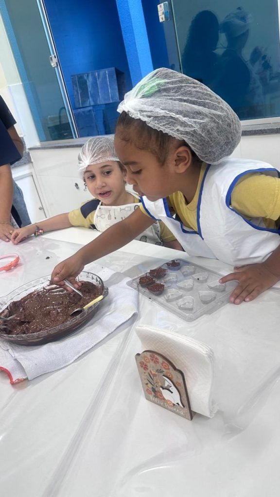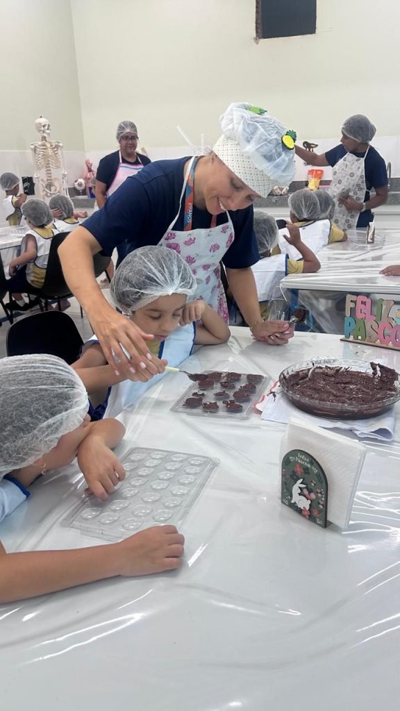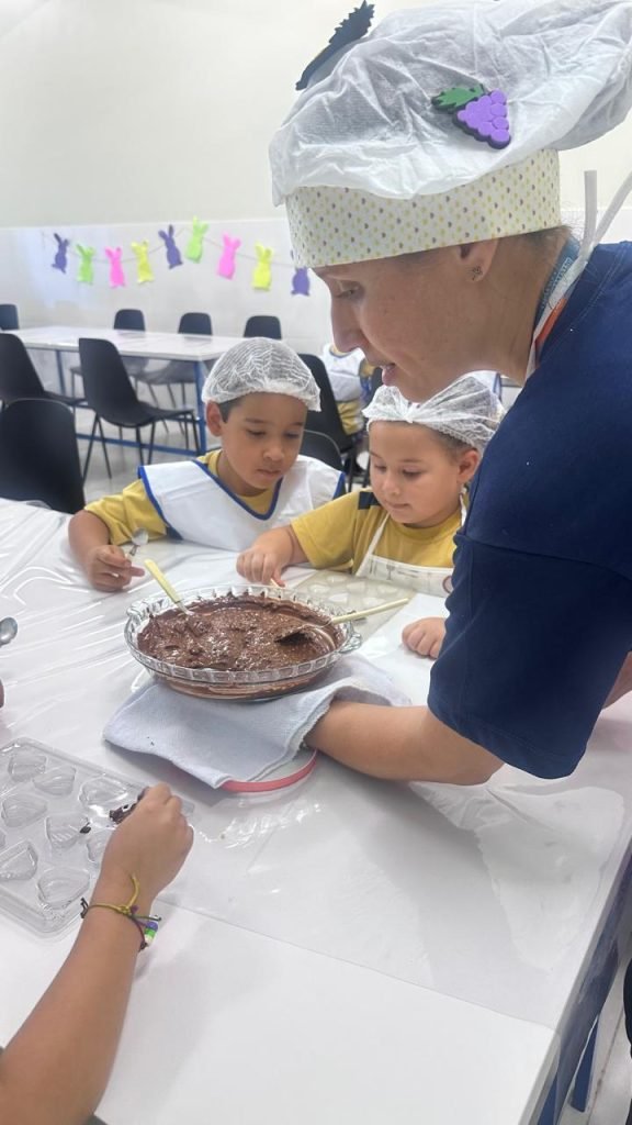 Como parte desse projeto, os alunos do 2º período, sob a orientação da professora Mary, participaram de uma aula de culinária na qual confeccionaram ovinhos de Páscoa. Durante a atividade, as crianças tiveram a oportunidade de vivenciar experiências práticas que estimularam a coordenação motora, o trabalho em equipe, a organização e o respeito às etapas do processo, além de desenvolverem a autonomia e o senso de responsabilidade.