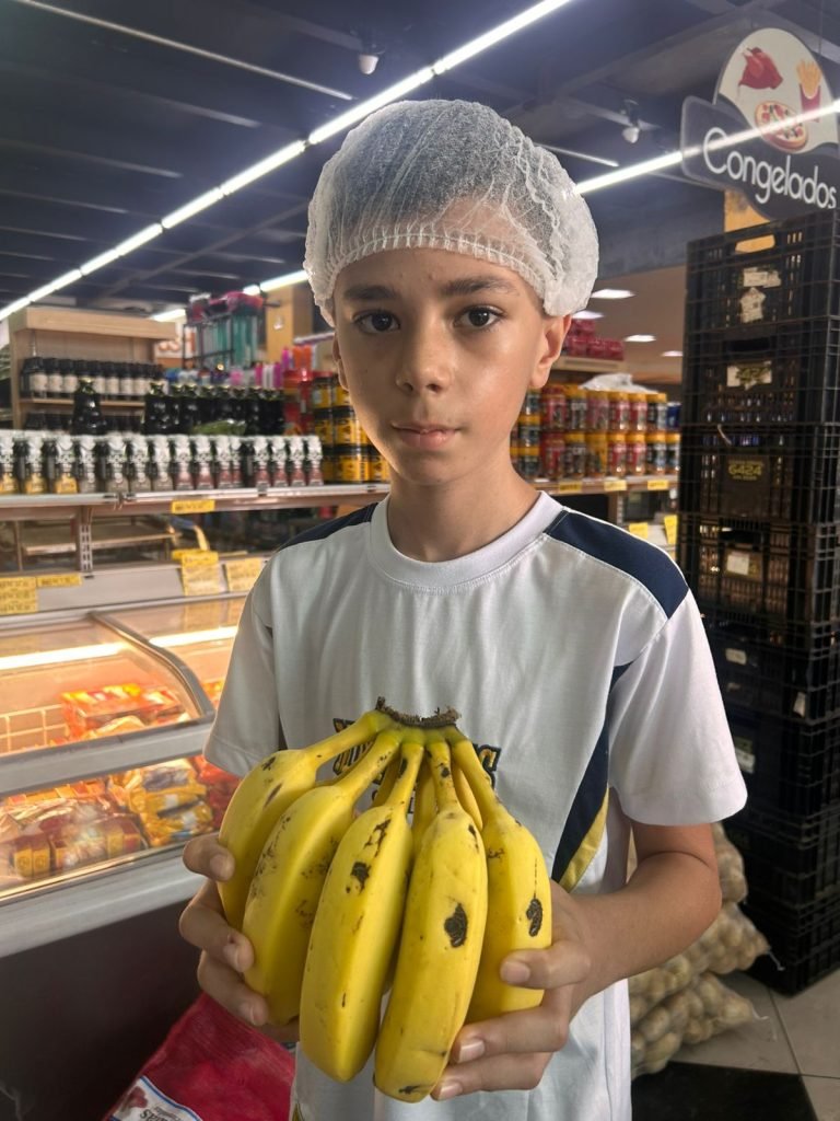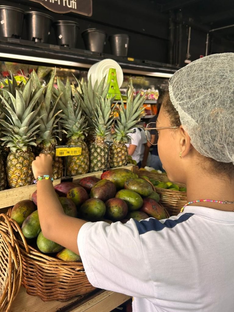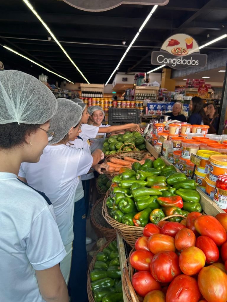 No espaço do sacolão do supermercado, as turmas do 6º ano realizaram atividades como comparação de preços, análise de valores por quilo, uso da balança e resolução de situações do cotidiano relacionadas às compras. Ao observar os produtos, calcular valores e analisar diferentes opções, os estudantes puderam perceber como conceitos matemáticos estão presentes em situações reais de consumo.